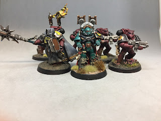 My plan is to either use him as part of a command squad (Horus having sent him to keep an eye on the fanatic Wordbearers) or in smaller games as a medic for my large tactical squad as the encouraging words blasting out of the vox casters ("Horus for Hope! Horus for Hope! Give me an H.... Give me an O....") will do enough to lift the spirits of the wordbearers to see them fight on, even though greviously wounded in body. Here he is with his intended squadmates and Chaplain